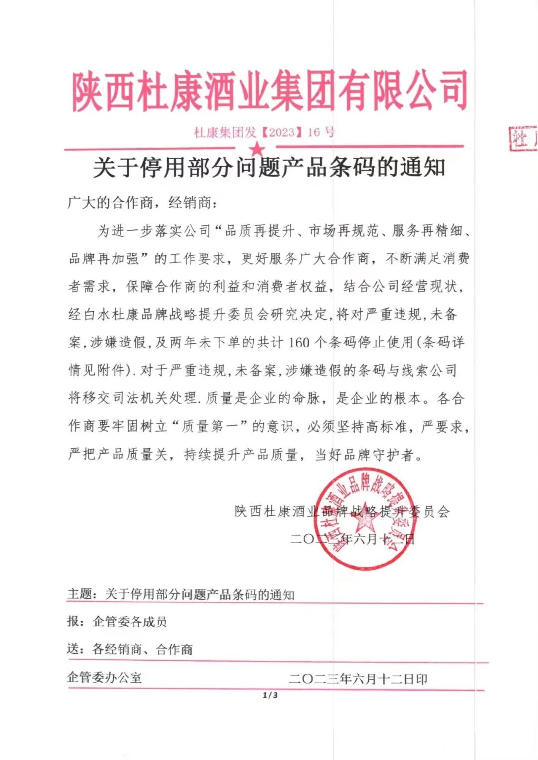 陕西杜康酒业集团再发停用部分条码通知,违规必罚!