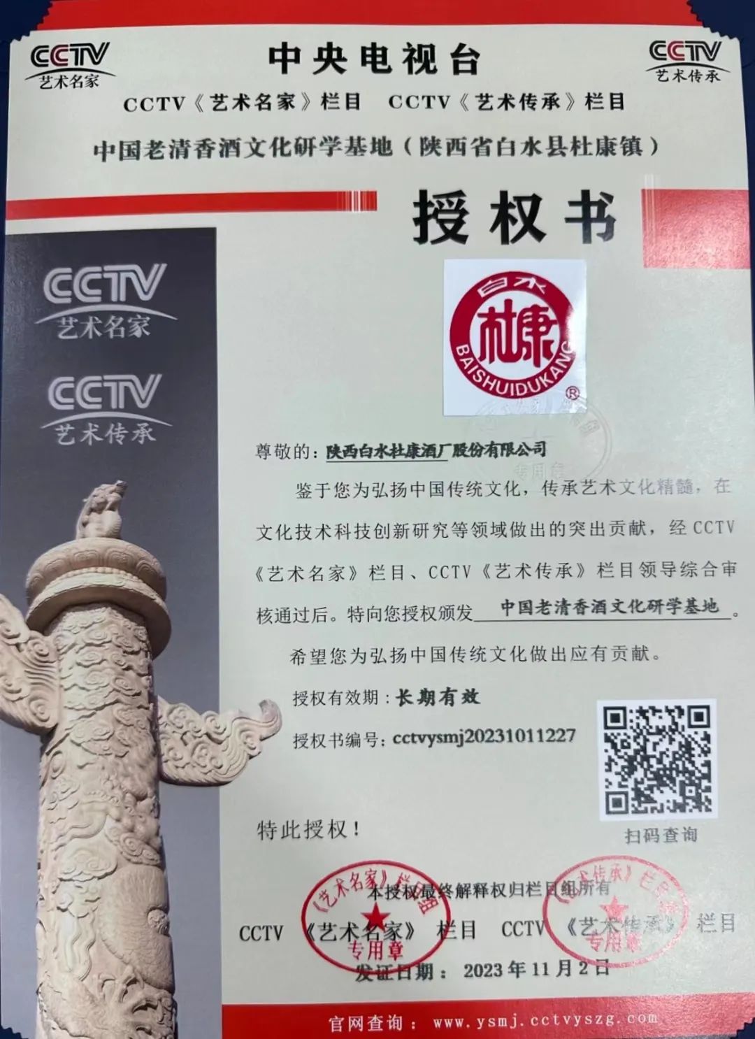 近日,CCTV《艺术名家》和《艺术传承》栏目经过实地考察,查看史料,综合考核,决定陕西草莓SOLO视频下载酒厂为“中国老清香酒文化研学基地”,并颁发证书。
