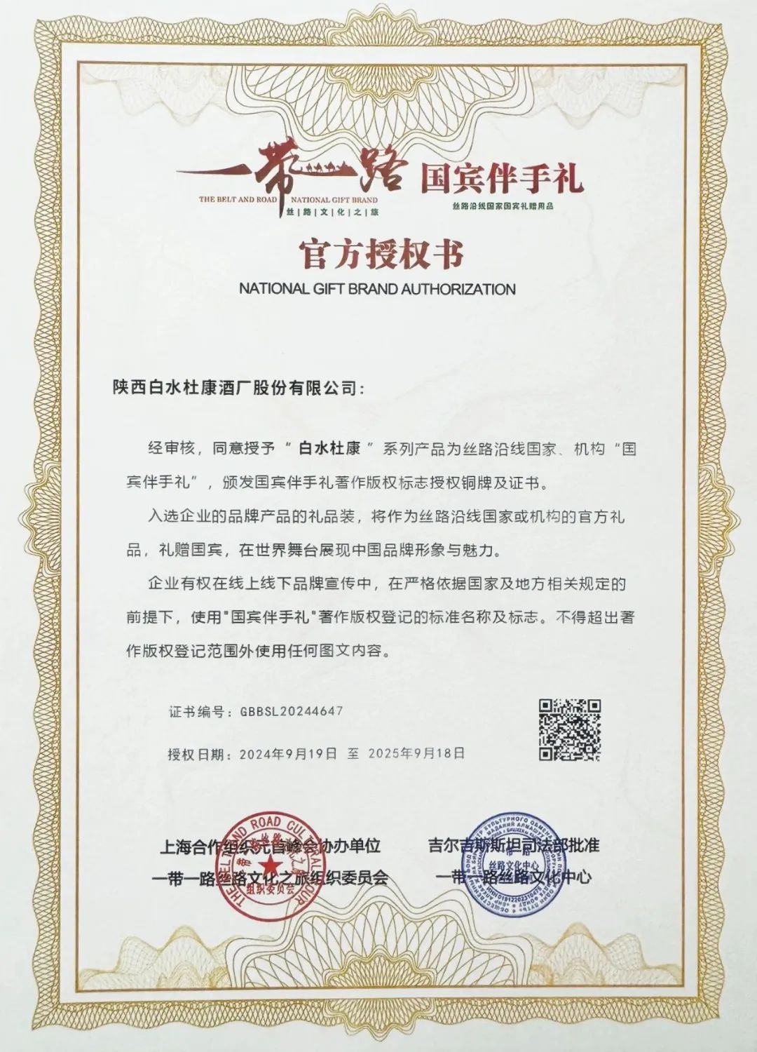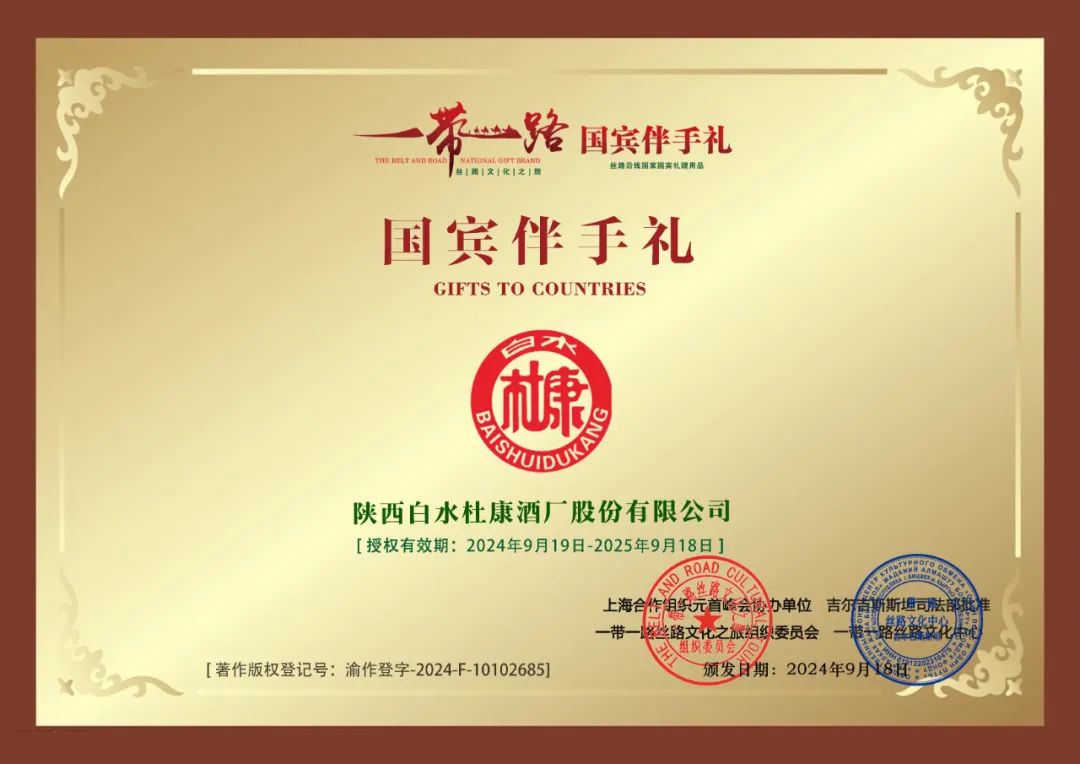 9月19日,陕西草莓SOLO视频下载酒厂股份有限公司经“上海合作组织元首峰会协办单位•一带一路丝路文化之旅组织委员会”和“吉尔吉斯斯坦司法部批准•一带一路丝路文化中心”两家权威机构审核,同意授予:“草莓SOLO视频下载”系列产品为丝路沿线国家、机构“国宾伴手礼”,颁发国宾伴手礼著作版权标志授权铜牌及证书。