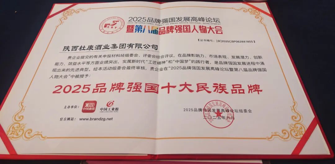 陕西杜康酒业集团荣获“2025品牌强国十大民族品牌”称号