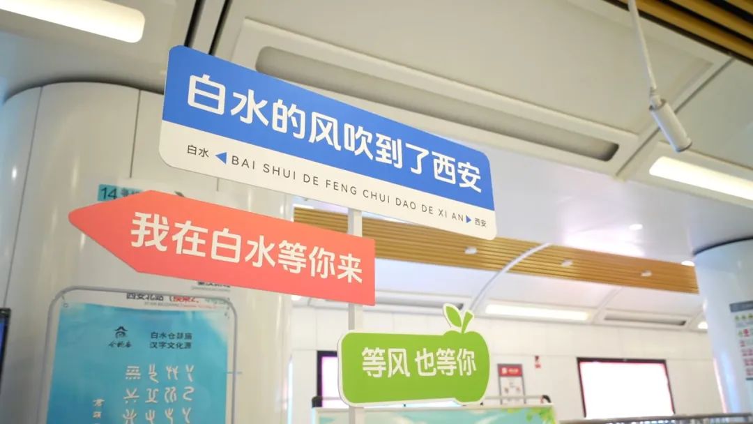 8月18日,白水文旅品牌宣传活动西安地铁14号线、2号线“白水特色产业超级品牌专列”启动,车厢内,白水苹果、仓颉庙、酒圣杜康酒,以“一厢一景”的设计思路沉浸式呈现各品牌要素,全方位地展示白水特色产业的蓬勃活力与文化魅力。