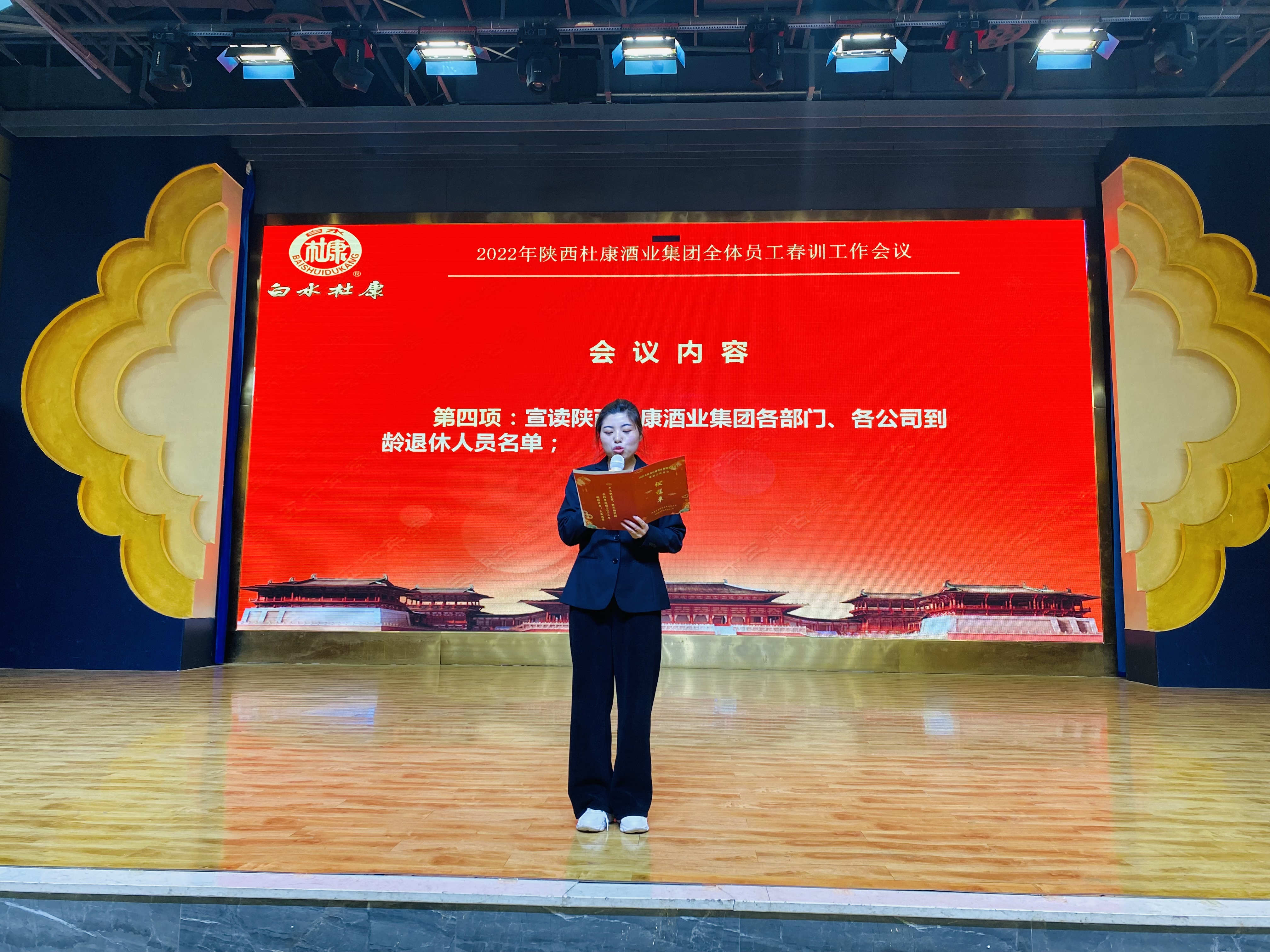 集团人力资源部张敏宣读《陕西杜康酒业集团关于举行2021年度退休人员欢送仪式的决定》