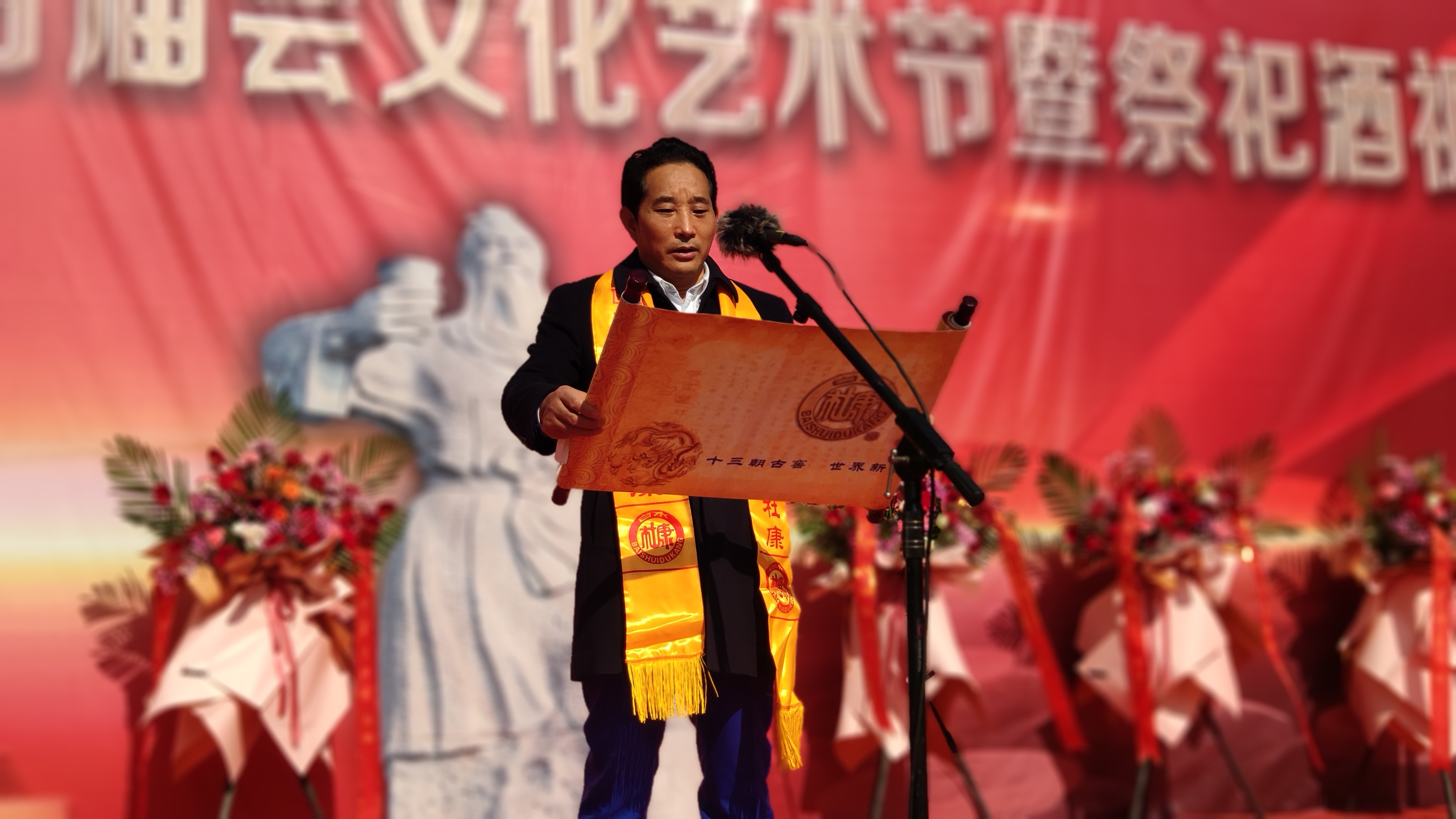 上午10点58分,酒圣故里,鞭炮齐鸣,集团总裁王勇盛在酒圣杜康像前庄严宣告:“任寅年杜康千年古庙会文化艺术节暨祭祀酒圣仪式” 正式开始,祭祀仪式遵从古训,敬献花篮、恭读祭文、拜谒杜康墓、净手上香......在庄重肃穆的大典上,抒发对酒圣杜康造酒福泽的感念,传达复兴杜康酒业的心愿。